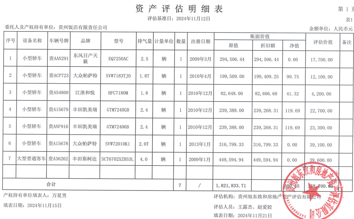 项目名称 贵州饭店转让车辆一批(三次降价)
